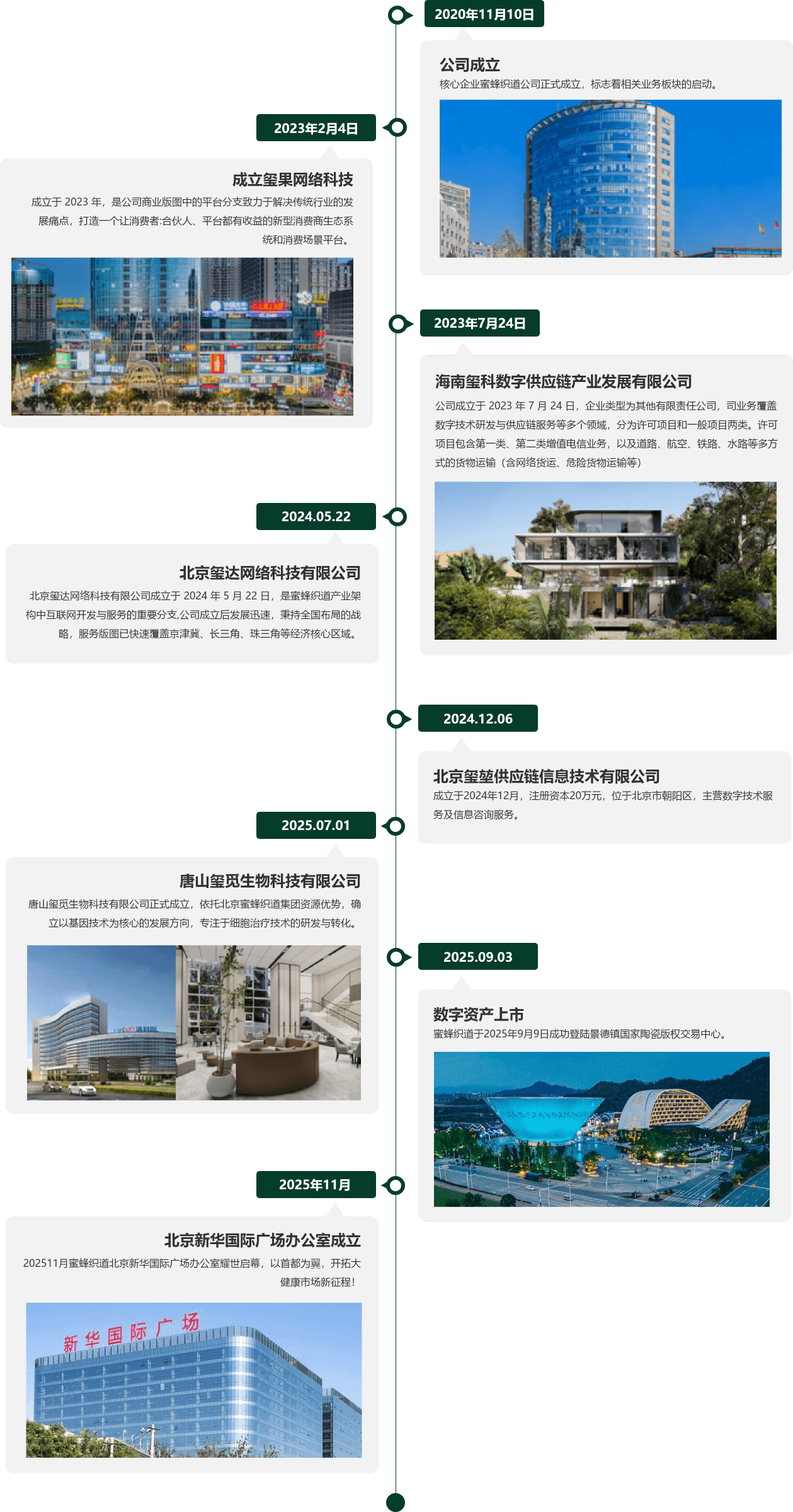 企业概况 以基因级生命科技 重塑健康未来 北京蜜蜂织道网络科技有限公司,成立于2020年,依托于准上市公司的公信力及信誉背书,秉承“解锁生命密码,智愈健康未来,守护人类生命质量”的使命,以创新为引擎,以数据为纽带,打造高效协同、并持续进化的组织生态,以产品、服务为核心竞争力,抓住时代机遇,成为全球细胞科技与AI智慧生态的引领者,让蜜蜂织道成为健康生活和财富共享平台。 6 + 核心技术方向 100 + 研发人员 35 + 专利技术